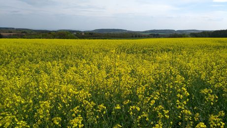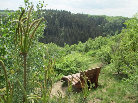 Nun gehen wir den Wanderweg entlang durch den "Bachberg", bis wir an die schöne Roteichenecke kommen, welche sich die Natur selbst gepflanzt hat. Wir folgen dem Weg weiter und kommen aus dem Wald heraus. Ein Stück gehen wir am Waldrand entlang, bis es nach links abgeht. Nach ca. 200m geht es dann wieder rechts, an der Vogelhecke vorbei, mit einem herrlichen Blick bis zu den Höhen des Hunsrück.